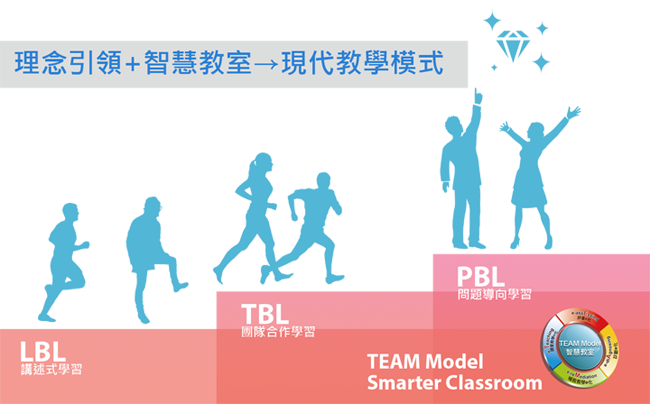 智慧教室支持系統,是基於現代教育理念設計的教與學系統,不但可以協助教師實現各種現代教學模式,例如TBL團隊合作學習,一對一、PBL問題導向...等,更重要的是協助教師,進一步提煉更便利、更效能、更智慧的教學模式。簡言之,教學系統具有輔助專業發展功能,可以不斷提升理念與專業發展。