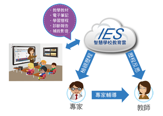雲端整合的支持系統,可以自動記錄教學過程,生成龐大教學數據,包括數位教材、電子筆記,活動歷程、診斷報告和補救影音等。教師能以更為科學的方式反思教學歷程,當然,透過授權,可以邀請專家諮詢與輔導,因為充分瞭解教學歷程,獲得像教練般的指導與成長。