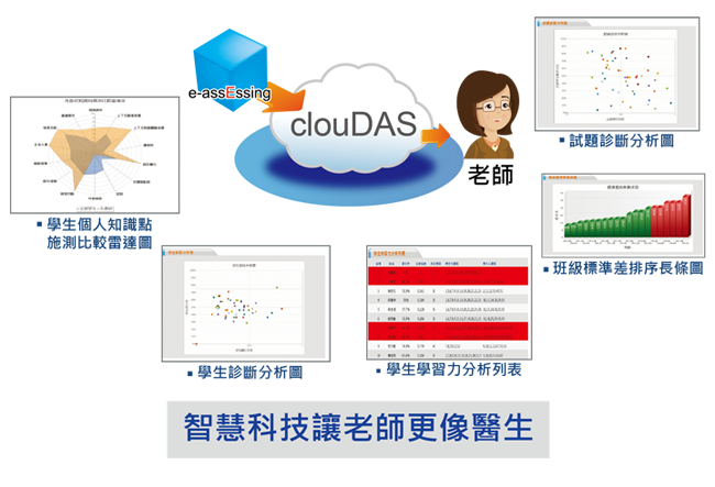 透過自動化網路閱卷系統與診斷報告服務,將傳統試卷巧妙地數位化,產出診斷分析報告,能讓命題品質、教學品質、學習品質等三個面向進行更科學的評估分析,使老師更像醫生,充分與科學地掌握教學、評量、診斷等教育關鍵環節。