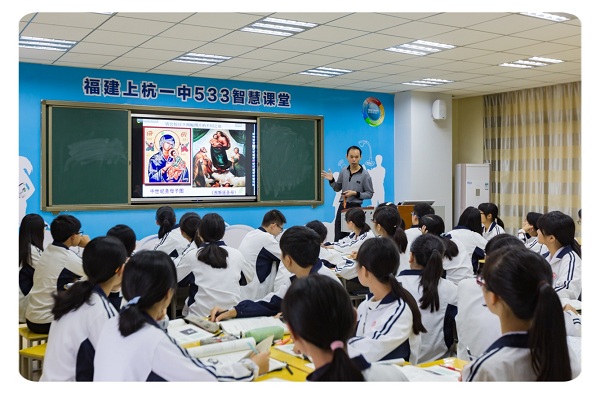 初期使用IRS智慧教室的上杭一中,2016年正式導入「HiTeach TBL」,配合一組一平板的團隊合作學習模式,課堂又產生了不一樣的化學變化,傳統課程上學生多半是自己學自己的,現在透過分組合作學習、小組之間對問題的探討、想法上的交流、討論,最後的發表,這些活動變得比以前多得多。